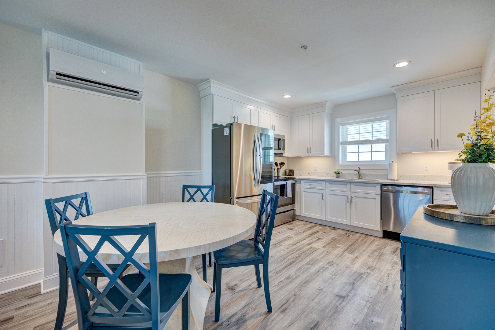 ...Your fully equipped kitchen features modern appliances and charming blue dining chairs where you'll enjoy home-cooked meals together.