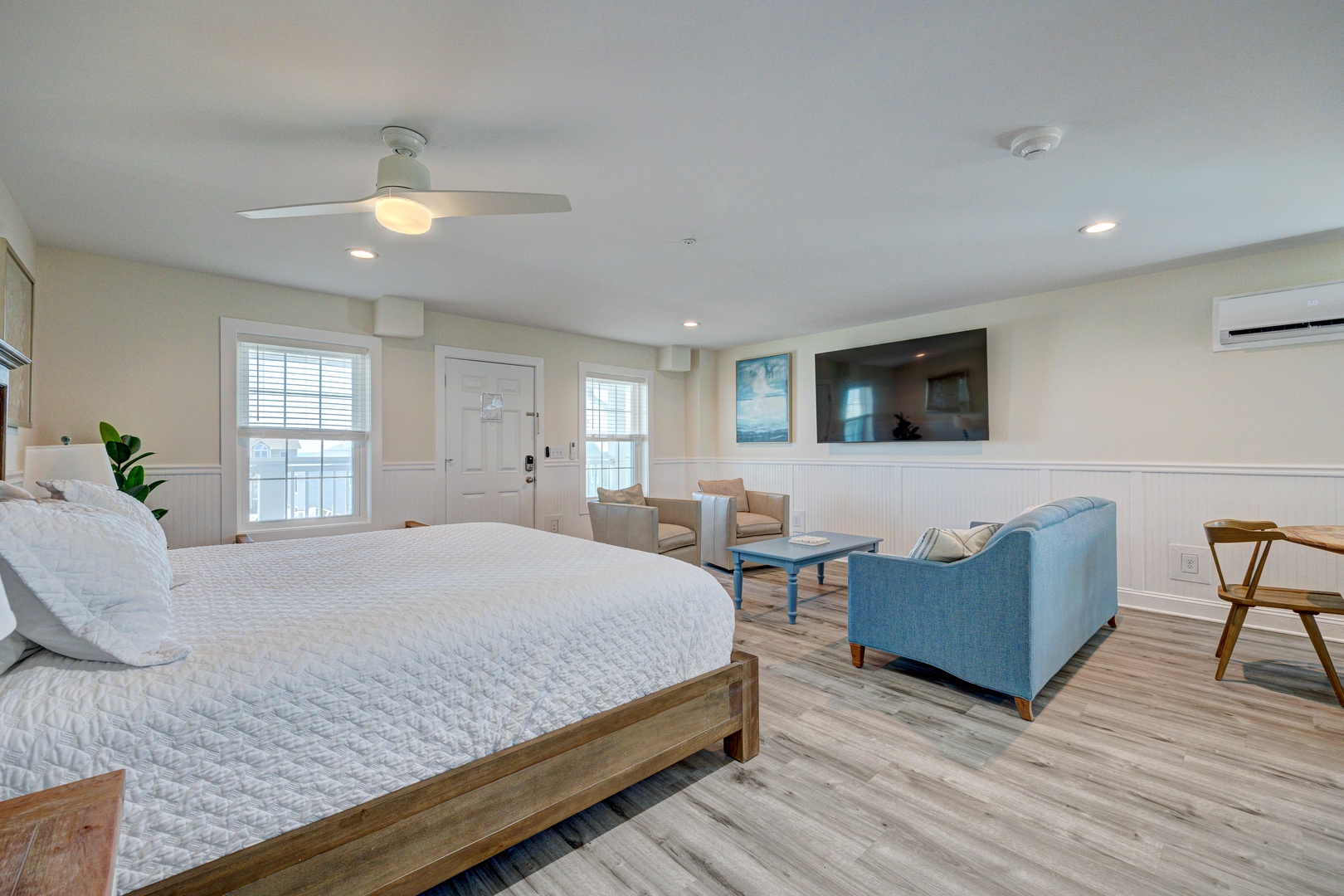 Experience the natural beauty and charm of Topsail Island from this luxury hybrid hotel suite with 700 square feet of well designed modern living space and captivating views of the Atlantic Ocean. Wake up in the comfort of this private 1st floor suite with one luxurious king size bed, a modern kitchen complete with granite countertops, stainless steel appliances, and a dining table and chairs. Here, you will also have a spacious living area complete with a queen size sleeper-sofa, a coffee table and club chairs, and a 75 inch Smart HDTV with fiber cable television service and high speed WiFi. When you arrive, your beds will be made with crisp, fresh linens and you will find plush white towels in the bathroom. We provide you with all you need to start off a relaxing and simplified vacation right, including luxury bedding, bath towels, travel size shampoo/conditioner /bath soap, kitchen cooking essentials including a Keurig coffee maker and starter supply of k-cups and coffee condiments, and a starter supply of dish soap, laundry soap, toilet paper, paper towels, and trash bags. On the ground level we have a spacious covered outdoor guest common area with multiple seating areas and games such as ping-pong, corn hole, and tiki/ring toss where you can gather with family, friends and other guests. Guests can unwind and enjoy a refreshing swim in our seasonal outdoor saltwater pool, providing a hassle-free alternative to beach activities without the inconvenience of sand. You will find we have 4 fully enclosed outdoor showers with hot and cold water so you can use them all year long! We also have 8 beach cruisers we welcome you to check out and ride anytime during your stay at no additional cost! Located one block from the beach between the Atlantic Ocean and the Sounds of the Intracoastal Waterway, whether you're seeking adventure and exploration or relaxation and rejuvenation, Saltwater Resort delivers life's greatest luxuries. We are centrally located near restaurants and shopping, but we are perfectly nestled on a quiet, low traffic street one block from the beach and just four blocks from central Surf City and the Surf City Bridge. You can simply walk or bike to explore local restaurants, get ice cream, shop, or head out to a laid back beach bar with live music! Surf City is a charming, laid back area located in the heart of Topsail Island centrally located between Topsail Beach (south end of the Island) and North Topsail Beach (north end of the Island). This incredible Island has 26 miles of coastline and here you will find some of the most beautiful beaches and clear blue water on the East Coast. This peaceful place of refuge for adults is also paradise for the kids! Walk to the beach to swim, surf, boogie board, build sandcastles, watch for dolphins or hunt for shells, take a bike ride to get ice cream or to Soundside Park to play or fish for crabs off the docks. You can book an adventure to kayak, paddle-board, sail, or jet ski all within sight of this incredible property! Our hotel is perfect for extended-stay vacations, weekend getaways, and one night stays! Reservations for your vacation can be made online. This property is managed by BlueStar Real Estate and rental payments are processed by Ascent. Payments: At the time of your booking, you will be charged 1/2 of the cost of your stay (including all fees and tax). The remaining 2nd 1/2 will be scheduled to be automatically charged to the same payment method 24hrs before your check-in.
