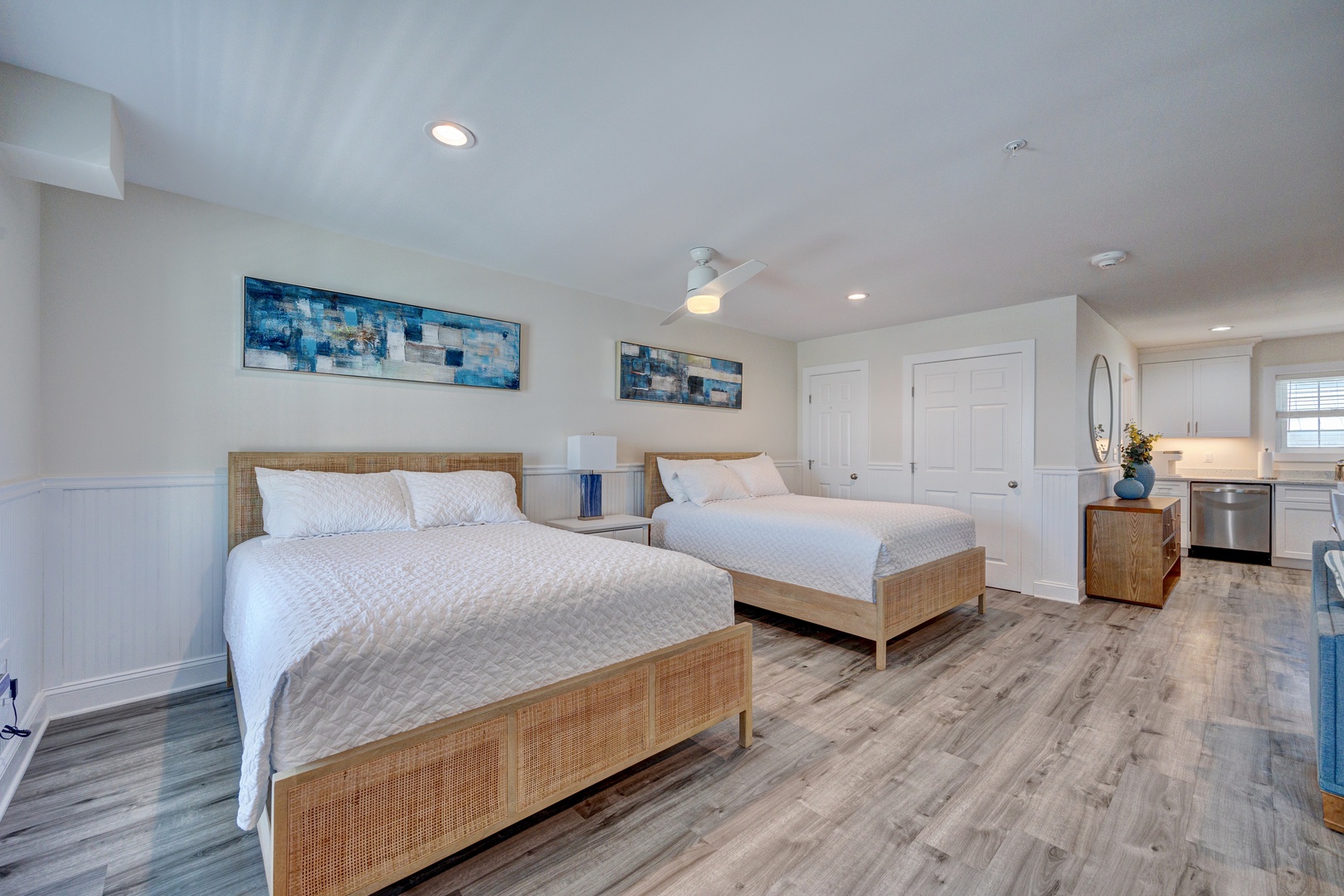 Experience the natural beauty and charm of Topsail Island from this luxury hybrid hotel suite with 2,100 square feet of well designed modern living space and captivating views of the Atlantic Ocean. Wake up in the comfort of these private 3rd floor suite units right next door to one another. One of the suites will have one king bed and the other suites will have two queen beds in each. All units contain a modern kitchen complete with granite countertops, stainless steel appliances, and a dining table and chairs. Here, you will also have a spacious living area complete with a queen size sleeper-sofa, a coffee table and club chairs, and a 75 inch Smart HDTV with fiber cable television service and high speed WiFi. In your suite you will also have a full size front loading washer and dryer. When you arrive, your beds will be made with crisp, fresh linens and you will find plush white towels in the bathroom. We provide you with all you need to start off a relaxing and simplified vacation right, including luxury bedding, bath towels, travel size shampoo/conditioner /bath soap, kitchen cooking essentials including a Keurig coffee maker and starter supply of k-cups and coffee condiments, and a starter supply of dish soap, laundry soap, toilet paper, paper towels, and trash bags. On the ground level we have a spacious covered outdoor guest common area with multiple seating areas and games such as ping-pong, corn hole, and tiki/ring toss where you can gather with family, friends and other guests. Guests can unwind and enjoy a refreshing swim in our seasonal outdoor saltwater pool, providing a hassle-free alternative to beach activities without the inconvenience of sand. You will find we have 4 fully enclosed outdoor showers with hot and cold water so you can use them all year long! We also have 8 beach cruisers we welcome you to check out and ride anytime during your stay at no additional cost! Located one block from the beach between the Atlantic Ocean and the Sounds of the Intracoastal Waterway, whether you're seeking adventure and exploration or relaxation and rejuvenation, Saltwater Resort delivers life's greatest luxuries. We are centrally located near restaurants and shopping, but we are perfectly nestled on a quiet, low traffic street one block from the beach and just four blocks from central Surf City and the Surf City Bridge. You can simply walk or bike to explore local restaurants, get ice cream, shop, or head out to a laid back beach bar with live music! Surf City is a charming, laid back area located in the heart of Topsail Island centrally located between Topsail Beach (south end of the Island) and North Topsail Beach (north end of the Island). This incredible Island has 26 miles of coastline and here you will find some of the most beautiful beaches and clear blue water on the East Coast. This peaceful place of refuge for adults is also paradise for the kids! Walk to the beach to swim, surf, boogie board, build sandcastles, watch for dolphins or hunt for shells, take a bike ride to get ice cream or to Soundside Park to play or fish for crabs off the docks. You can book an adventure to kayak, paddle-board, sail, or jet ski all within sight of this incredible property! Our hotel is perfect for extended-stay vacations, weekend getaways, and one night stays! Reservations for your vacation can be made online. This property is managed by BlueStar Real Estate and rental payments are processed by Ascent. Payments: At the time of your booking, you will be charged 1/2 of the cost of your stay (including all fees and tax). The remaining 2nd 1/2 will be scheduled to be automatically charged to the same payment method 24hrs before your check-in.