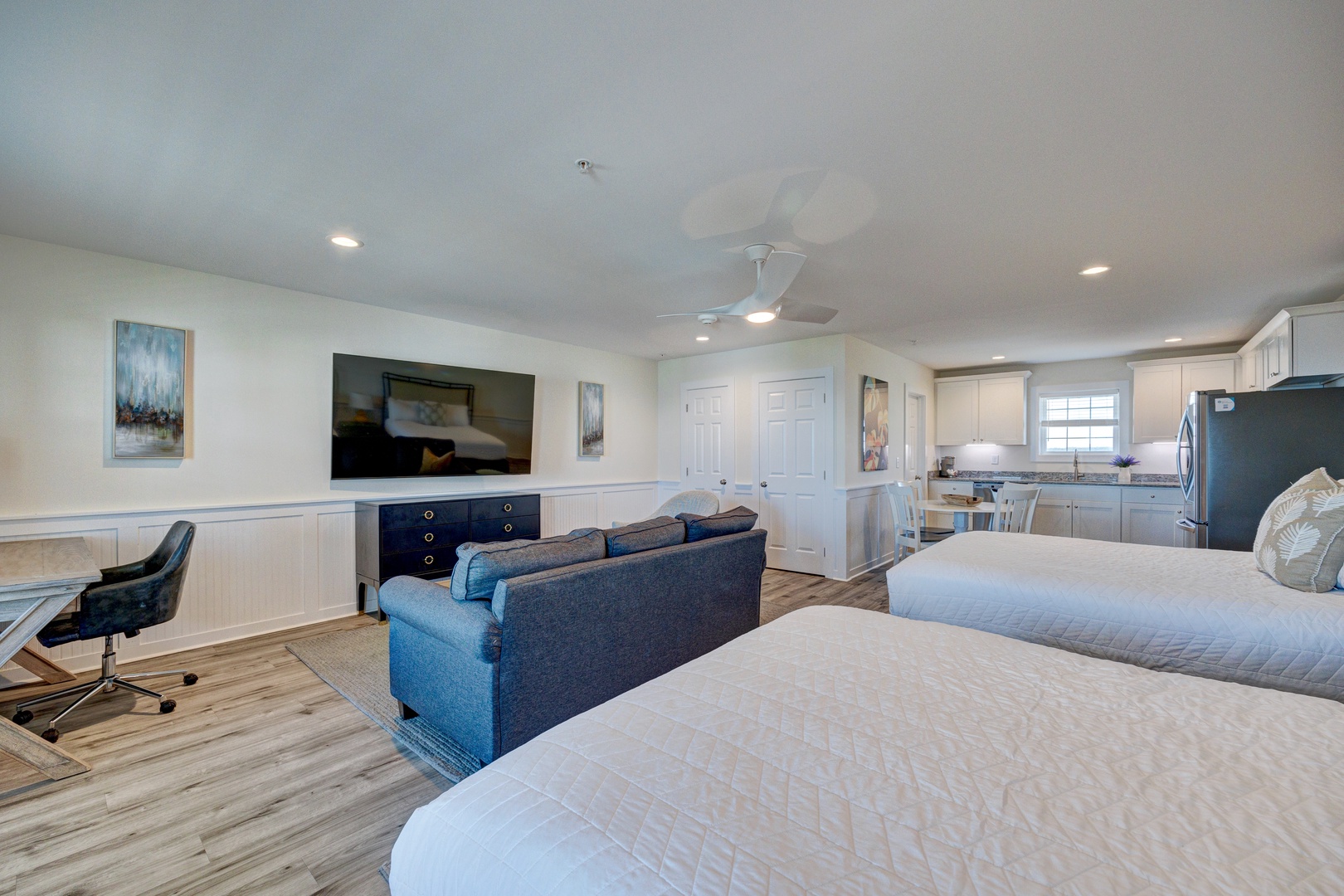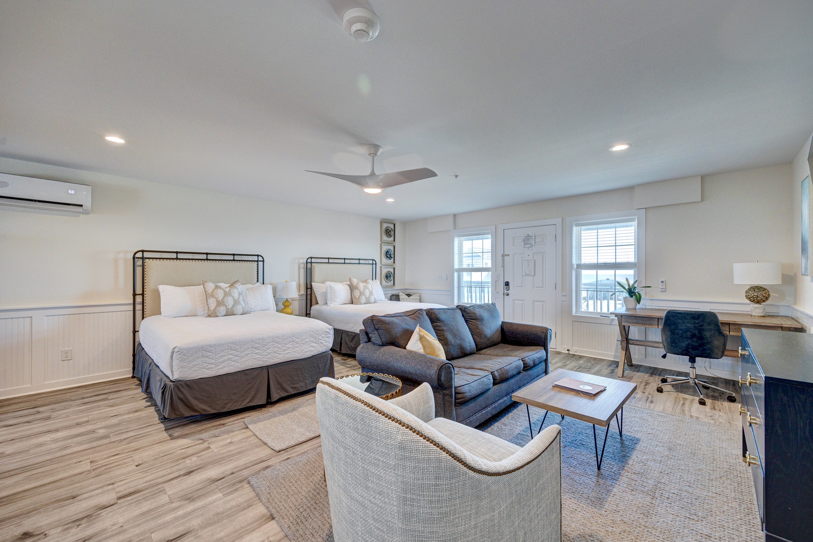 Experience the natural beauty and charm of Topsail Island from this luxury hybrid hotel suite with 700 square feet of well designed modern living space and captivating views of the Atlantic Ocean. Wake up in the comfort of this private 1st floor suite with two luxurious queen sized beds, a modern kitchen complete with granite countertops, stainless steel appliances, and a dining table and chairs. Here, you will also have a spacious living area complete with a queen size sleeper-sofa, a coffee table and club chairs, and a 75 inch Smart HDTV with fiber cable television service and high speed WiFi. In your suite you will also have a full size front loading washer and dryer. When you arrive, your beds will be made with crisp, fresh linens and you will find plush white towels in the bathroom. We provide you with all you need to start off a relaxing and simplified vacation right, including luxury bedding, bath towels, travel size shampoo/conditioner /bath soap, kitchen cooking essentials including a Keurig coffee maker and starter supply of k-cups and coffee condiments, and a starter supply of dish soap, laundry soap, toilet paper, paper towels, and trash bags. On the ground level we have a spacious covered outdoor guest common area with multiple seating areas and games such as ping-pong, corn hole, and tiki/ring toss where you can gather with family, friends and other guests. You will find we have 8 outdoor showers with hot and cold water so you can us them all year long! We also have 8 beach cruisers we welcome you to check out and ride anytime during your stay at no additional cost! Located one block from the beach between the Atlantic Ocean and the Sounds of the Intracoastal Waterway, whether you're seeking adventure and exploration or relaxation and rejuvenation, Saltwater Suites delivers life's greatest luxuries. We are centrally located near restaurants and shopping, but we are perfectly nestled on a quiet, low traffic street one block from the beach and just six blocks from central Surf City and the Surf City Bridge. You can simply walk or bike to explore local restaurants, get ice cream, shop, or head out to a laid back beach bar with live music! Surf City is a charming, laid back area located in the heart of Topsail Island centrally located between Topsail Beach (south end of the Island) and North Topsail Beach (north end of the Island). This incredible Island has 26 miles of coastline and here you will find some of the most beautiful beaches and clear blue water on the East Coast. This peaceful place of refuge for adults is also paradise for the kids! Walk to the beach to swim, surf, boogie board, build sandcastles, watch for dolphins or hunt for shells, take a bike ride to get ice cream or to Soundside Park to play or fish for crabs off the docks. You can book an adventure to kayak, paddle-board, sail, or jet ski all within sight of this incredible property! Our hotel is perfect for extended-stay vacations, weekend getaways, and one night stays! Reservations for your vacation can be made online. This property is managed by BlueStar Real Estate and rental payments are processed by Ascent. Payments: At the time of your booking, you will be charged 1/2 of the cost of your stay (including all fees and tax). The remaining 2nd 1/2 will be scheduled to be automatically charged to the same payment method 24hrs before your check-in.